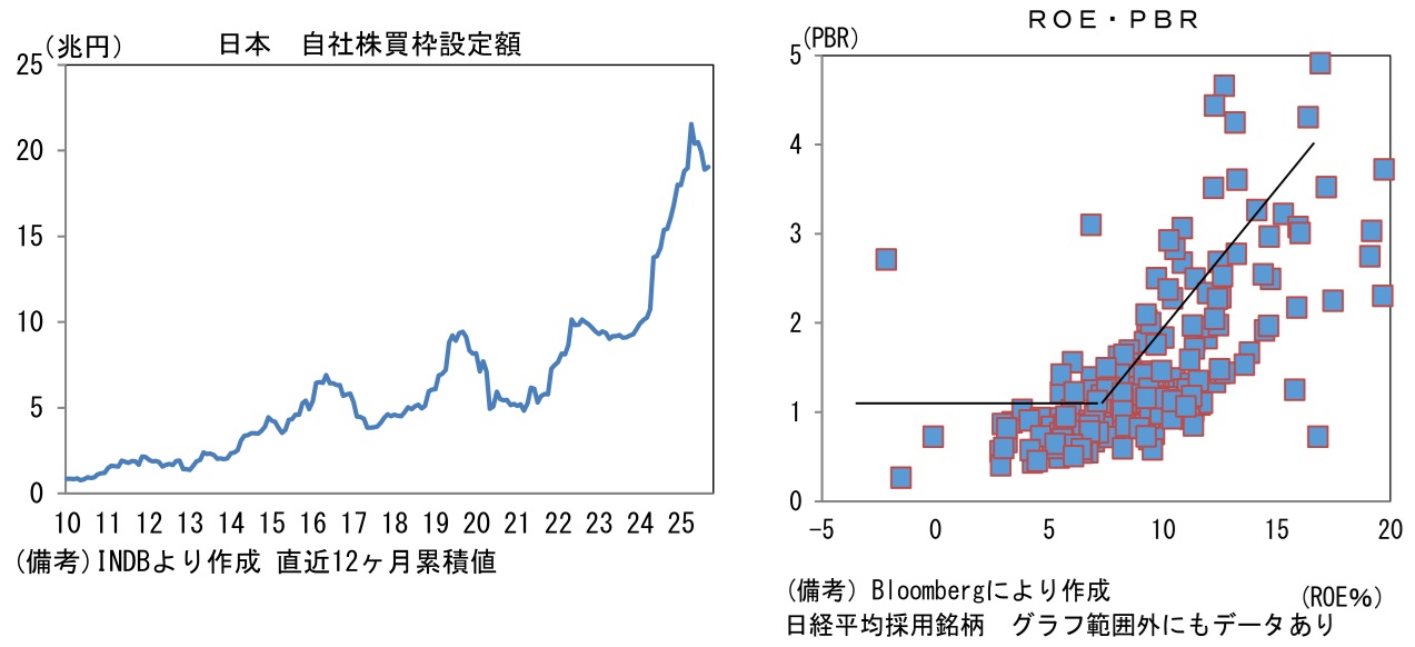 - その他では、企業の資本効率改善に向けた努力が株式市場で評価されよう。自社株買いの勢いはさすがに一服感があるものの、それでも3年前からは倍増した状態にあり、引き続き株価を押し上げると期待される。企業が自社株買いを進める背景には、低ROEに起因するPBR1倍割れの問題がある。低ROEの目安としては8%が広く意識されており、それを下回ると「株主資本を溶かす企業」という烙印を押され、PBRが1倍を割れる傾向にある。したがって、ROE8%の達成が危ぶまれる状況に陥れば、企業には自社株買いを活用し、一株当たり利益を増加させる誘因が働く。経常利益段階で減益だったとしても、投資家が最も重視する一株当たり利益が増加する事例は多々ある。日本企業の予想ROEは、日経平均採用銘柄でみれば10.8%、TOPIX採用銘柄でみれば9.3%であり、全体として8%を上回っている。ただし、株価指数ベースの数値は寄与度の大きい少数の銘柄によって平均値が押し上げられている面もあり、実際、日経平均採用銘柄のうち77社はROEが8%に届いていない。同様にROE10%未満の企業は127社、12%未満の企業は167社と過半を占める(11月26日時点)。このように良くも悪くも、低ROE・低PBRの企業が多く存在することは株式還元の余地が豊富にあることを意味する。自社株買いを巡っては「東証の要請に応じて仕方なく」、「見せかけの資本効率改善」という批判もあるが、それすらもしてこなかった企業も多かったため、まだまだそうした動きが投資家に評価される段階にあると判断される。