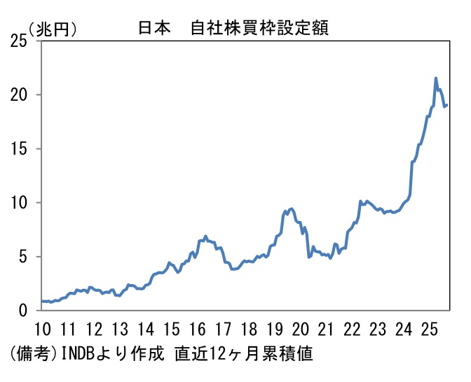 そして日銀の緩和的な金融政策も株式の追い風になろう。筆者は12月の利上げを予想するが、トランプ関税に翻弄された今春以降、植田総裁は明らかに慎重度合いが増しており、ハト派方向に傾斜している。極端な円安に直面すれば利上げペースが早まることも想定されるが、2026年末における政策金利水準は1.0%であると予想され、実質短期金利はマイナスの継続が見込まれる。また政策金利1%到達後の利上げは一段と慎重になると見込まれることから、2027年末時点でも実質金利はマイナスのままである可能性が相応に高い。こうした緩和的な金融環境の継続を前提にするならば、株式市場への資金流入が促されると考えるのが自然であろう。