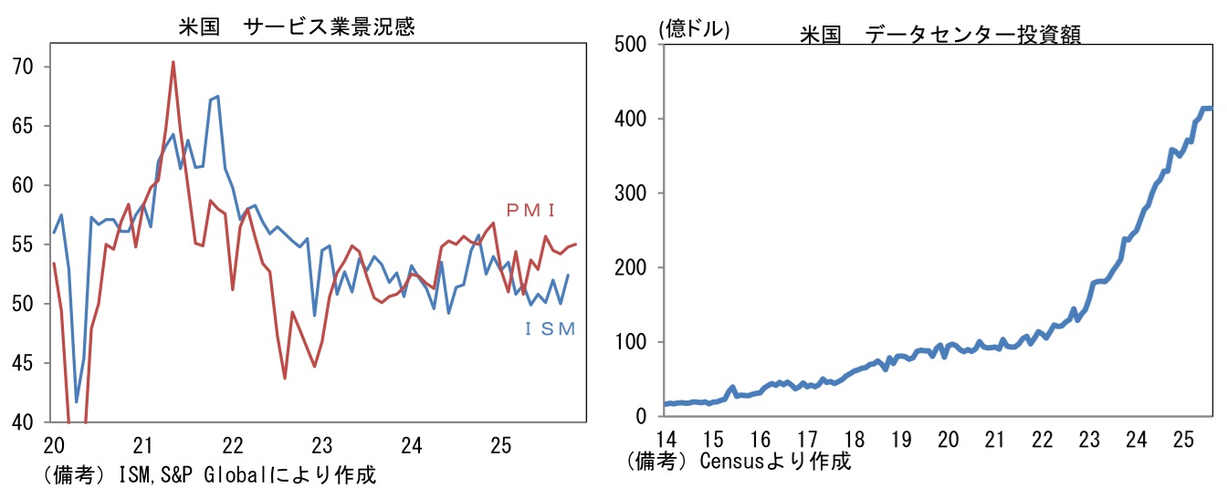 米国については、失業率がじりじりと上昇するなど労働市場の軟化が観察されている。もっとも、米経済の根幹とも言うべき個人消費は富裕層の高額消費に支えられ、底堅い成長軌道を維持している。ISMサービス業やサービス業PMIといった企業景況感指数は、必ずしも個人消費の動向に左右されるわけではないが、個人消費に裏打ちされた内需の底堅さが間接的に示されている。またAI関連投資の急増も重要。例えばデータセンター投資は5年前との比較で約4.5倍、建設支出全体に対して5.6%を占めるに至っており、それに付随して発電設備等の投資も活発になっていることから、米経済全体の底堅さに寄与している。この間、トランプ関税は財価格にその影響が表面化しているものの、春先に警戒されたような高インフレは回避されており、そうした下で、自動車販売台数は年換算1600万台前半を維持している。もちろん、メーカー各社が関税を吸収することによって価格が据え置かれていることが大きいが、米国の主要輸入元である地域からの関税率は15%と「穏健」であり、先行きも販売台数の崩壊は見込み難い。