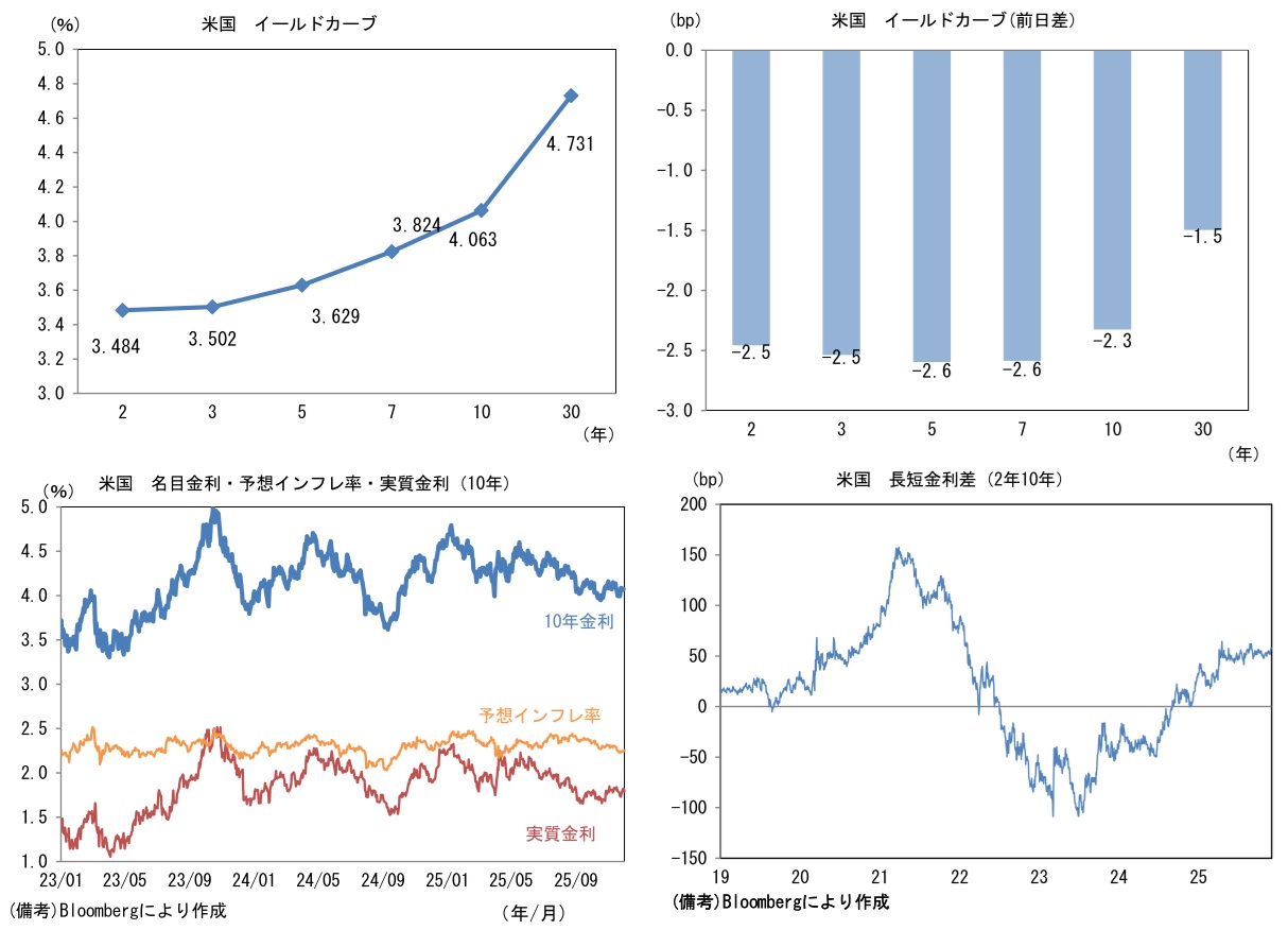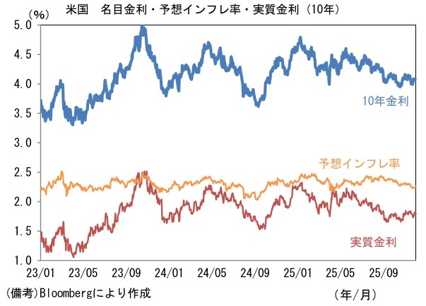 現在の米国経済は、軟化する労働市場、底堅さを維持する企業景況感、落ち着くインフレ率といった具合に強弱区々であり、政府機関が閉鎖されて以降の金融市場は、長期金利が概ね横ばい、株価は上昇傾向にある。先行きは、年明け後に発表と伝わっている次期FRB議長の人選に注目が集まろう。現時点でハセット氏が有力候補であると伝わっているが、同氏は「あまりにもトランプ大統領寄り」との評価もある。大統領の意向をくみ取るように短期金利を強引に引き下げれば、インフレ再加速の懸念から予想物価上昇率が高まることで、長期金利が上昇(ツイスト・スティープ化)する可能性があろう。株式は短期金利の低下期待から上昇、或いは長期金利の上昇を嫌気して下落、インフレヘッジの手段として買われる、といった具合に様々な反応が考えられる。