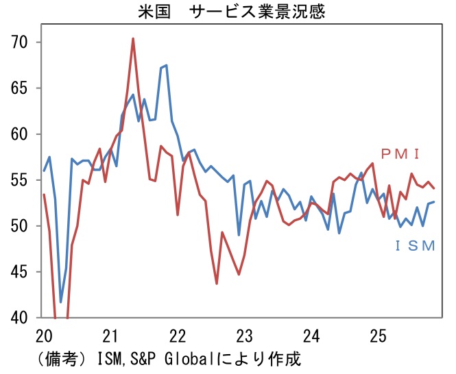 11月ISMサービス業は52.6と市場予想(52.0)に反して10月から0.2pt改善した。ヘッドラインを構成する4つの項目は事業活動(54.3→54.5)と新規受注(56.2→52.9)が共に50超を維持。雇用(48.2→48.9)は50以下の領域で改善。サプライヤー納期(50.8→54.1)は長期化し、ヘッドライン押し上げに寄与。その他ではCPIやPCEデフレーターの先行指標として注目されている仕入価格指数が65.4へと4.6ptもの低下を示した。関税由来の費用増、安価な労働力である移民雇用者数の減少に伴う人件費増加といったインフレ要因は残存するものの、企業段階における物価上昇圧力は沈静化の方向にあると判断される。堅調なサービス業の業況はFedの利下げに疑問を呈する一方、落ち着きつつあるインフレ圧力は利上げを正当化する。