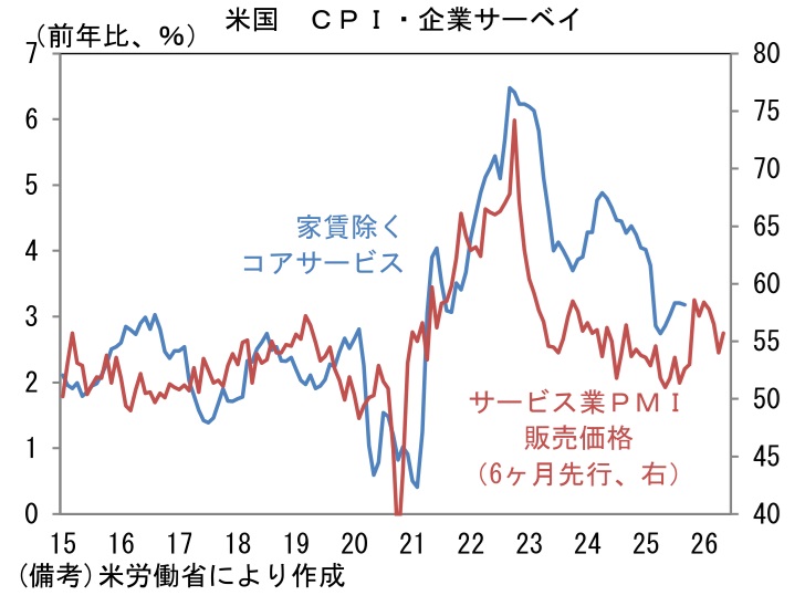 - こうした構図は、類似指標のサービス業PMIでも示された。ヘッドラインは54.1と速報値から0.9pt下方修正されたものの、事業活動(54.8→54.1)と新規受注(53.6→54.3)は共に50をはっきりと上回り、雇用(51.4→52.1)も底堅さを増した。インフレ関連項目では、販売価格が55.7へと1.7pt上昇したものの、大きくみれば低下基調にあり、CPIで示されるサービス価格(家賃とエネルギーを除く、いわゆるスーパーコア)の上昇率が鈍化していくことを示唆した。