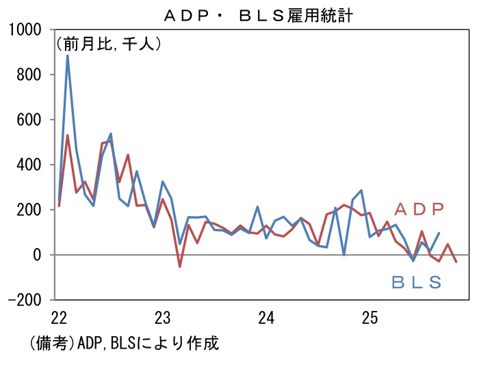 11月ADP雇用統計によると民間雇用者数は前月比▲3.2万人と市場予想(+1.0万人)に反して減少。3ヶ月平均値は同▲0.5万人、6ヶ月平均値は同+1.1万人となった。速報段階におけるADP雇用統計は必ずしもBLS雇用統計の先行指標として有用ではないが、労働市場の停滞を示す結果であった。