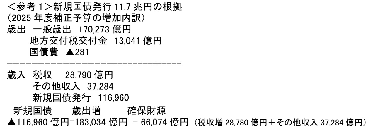 以下、少しテクニカルな話になるのをお許しいただきたい。総合経済対策に伴う2025年度補正予算の規模拡大は18.3兆円(183,034億円)である。この金額を工面するのに、11.7兆円(116,960億円)の新規国債発行を行う構えである。ならば、新規国債発行をゼロにするために、補正予算の規模を6.6兆円まで減額すればよい(予算案18.3兆円→修正後6.6兆円)。削減する補正予算の歳出規模は、11.7兆円ということでもある。
