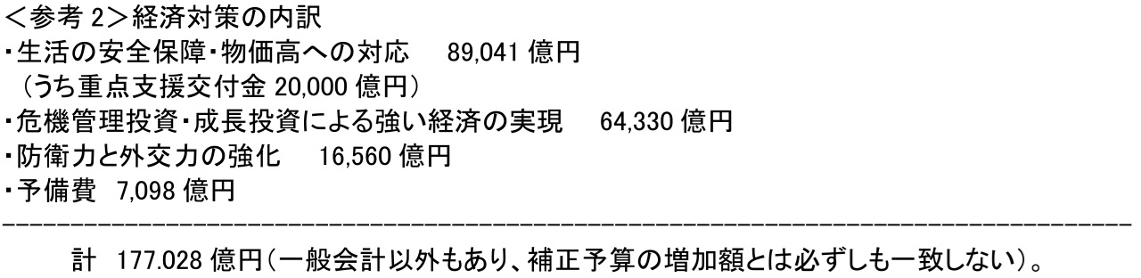 しかし、この積み上げ方式で計算した8.8兆円では、大枠から計算した11.7兆円にはまだ足らない。そこで、少し乱暴なやり方だが、重点支援交付金2.0兆円を削減する。実は、自然増収28,790億円によって、それを地方交付税交付金に回すという仕組みになっている。その金額が13,041億円になるので、これを以って実施しようとしていた物価高騰対策(おコメ券、商品券など)に対応すればよい。これで、ボトムアップで積み上げた歳出圧縮の合計額は8.8兆円から10.8兆円になり、11.7兆円に近づく。新規国債発行額を11.7兆円から0.9兆円に減額することは、年度内に本当に必要な内容を精査することで可能であると考える。