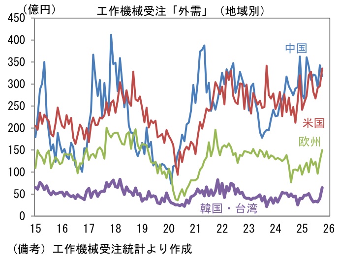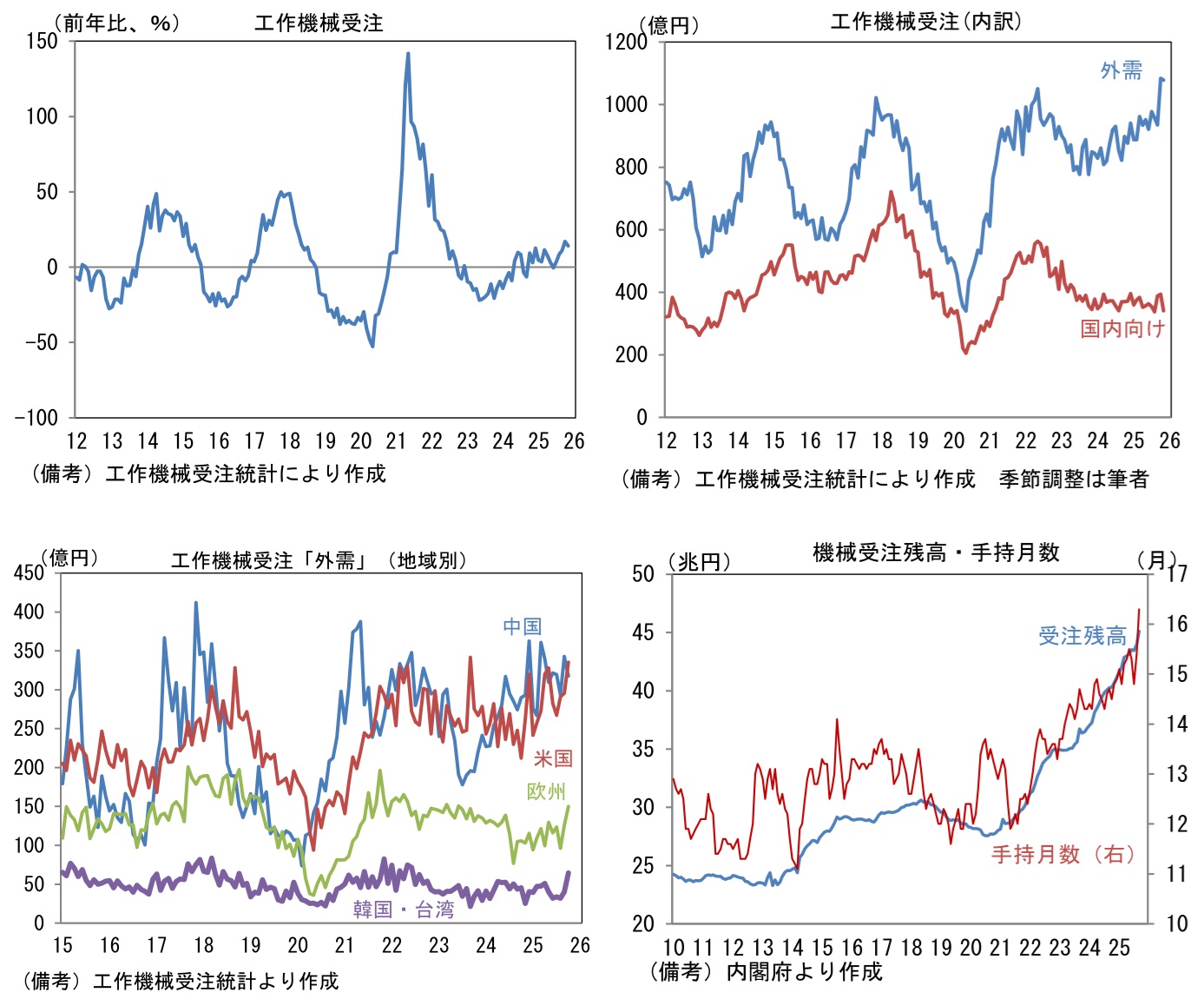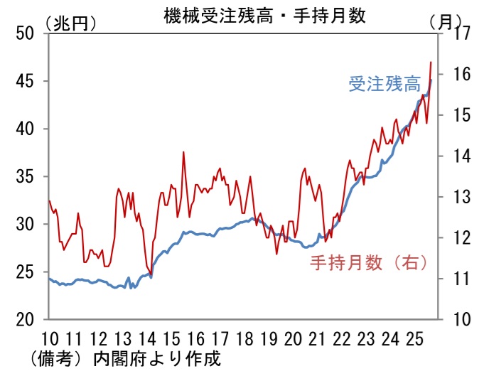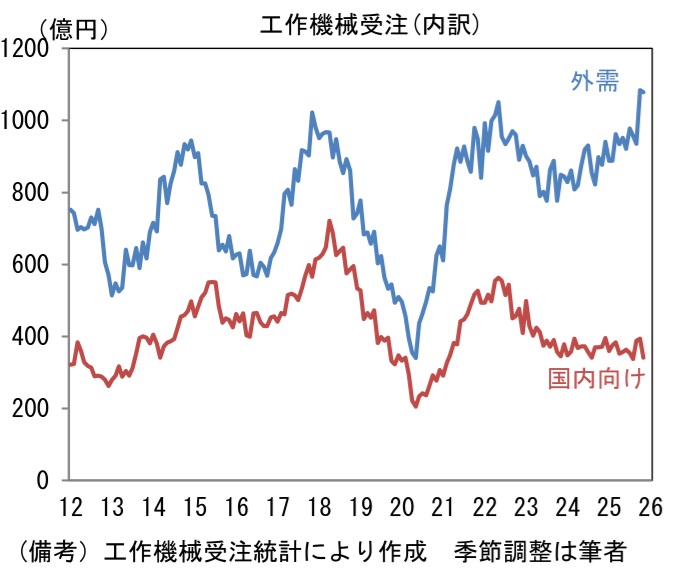 12月9日に発表された11月の受注額(原数値)は1362億円であった。前年比では+14.2%となり、伸び率は小幅に減速もしっかりとした増加基調を維持。筆者作成の季節調整値は前月比▲4.1%と減少したが、これは10月に同+12.3%と増加した反動であり、3ヶ月平均値では+3.3%と3ヶ月連続で増加している。単月の内訳は「国内向け」の季節調整済み前月比が▲13.3%と急減も、3ヶ月平均では同+0.4%と増加基調を維持。ただし前年比では▲8.1%とマイナス圏に沈んでいる。企業の投資意欲はそれなりに強いものの、人手不足が足かせとなり、設備投資の進捗が遅々としていることが一因として考えられる。関連投資の機械受注に目を向けると、受注残高および手持ち月数が積み上がっており、これに伴って新規受注が抑制されている可能性が示唆される。この間、「外需」は前月比▲0.5%と微減も、3ヶ月平均では+4.1%と力強い伸びを維持している。前年比では+23.2%と14ヶ月連続でプラスを維持し、いよいよ「離陸」の様相を呈してきた。地域別詳細は確報を待つ必要があるが、10月までの傾向から判断すると中国以外の地域が増加基調を維持したとみられる。