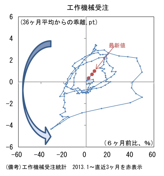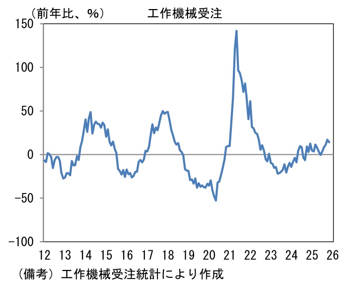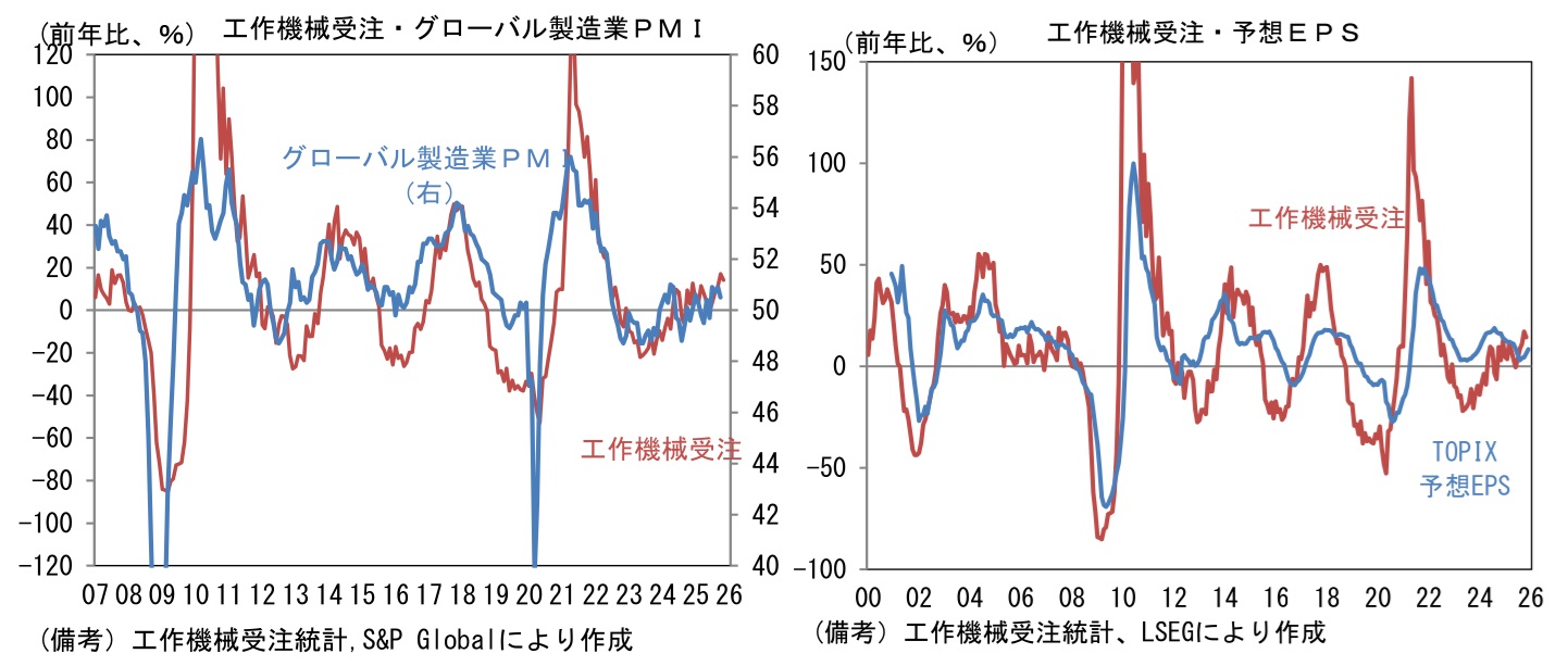 - 工作機械受注サイクルの位置取りを確認するために、縦軸に受注額の水準(36ヶ月平均値からの乖離)、横軸に方向感(6ヶ月前比)をとった循環図をみると、直近数ヶ月は中心点付近で小さな渦を描いてきたが、最新値は右上領域に向けて歩み出したようにみえる。過去の経験則に従うなら今後も右上方向の進路をとると予想され、回復傾向がはっきりとしてくるだろう。これまで世界の株式市場はAIの頭脳として半導体関連銘柄を中心に物色してきたが、今後はハードとの融合である「フィジカルAI」に対する関心が広がろう。その場合、工作機械を中心に本邦製造業はロボット、FA(ファクトリー・オートメーション)など多くの関連業種を抱える。この見方が正しければ、工作機械受注は株式市場の有用な情報を与えてくれるのではないか。