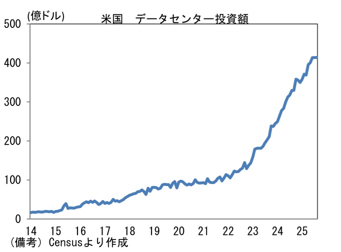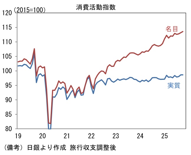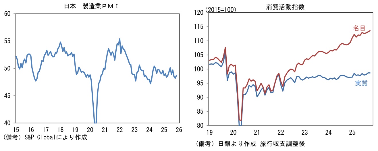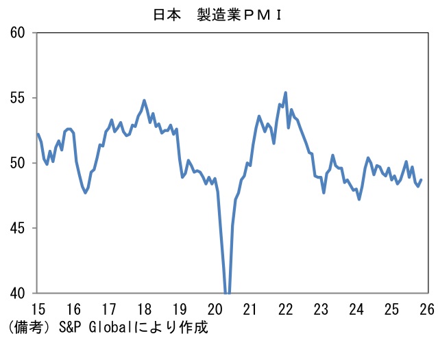 - 製造業PMIを地域別にみると、11月に日本は48.7へと0.5pt上昇した。トランプ関税による直接的な影響は限定的である一方、AI向け以外の半導体需要が力強さを欠き、製造業全体として加速感に乏しい展開が続いている。もっとも、個人消費が緩慢ながらも回復傾向にあることを踏まえれば、大崩れは想定しにくい。日銀が算出する消費活動指数は実質値も緩やかな増加基調にある。この間、IT関連財の生産集積地である台湾は48.8へと1.1pt上昇した。輸出統計を見る限り、台湾のIT関連財産業は活況を呈しているが、強さは一部企業のAI関連品目に集中しているため、製造業全体としては精彩を欠く姿になっている。この間、韓国は49.4で横ばいであった。もっとも、同国のPMIが50を超えることは稀であるため、それほど悲観すべき結果ではない。