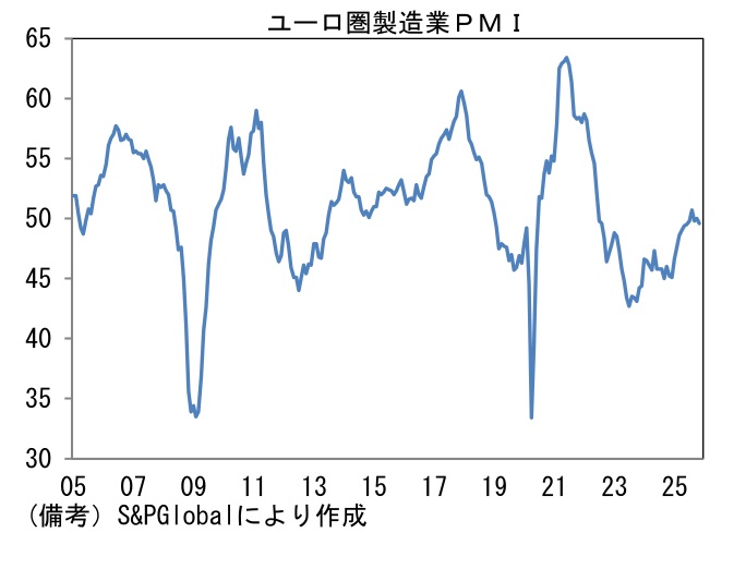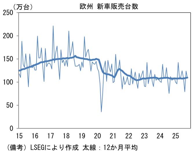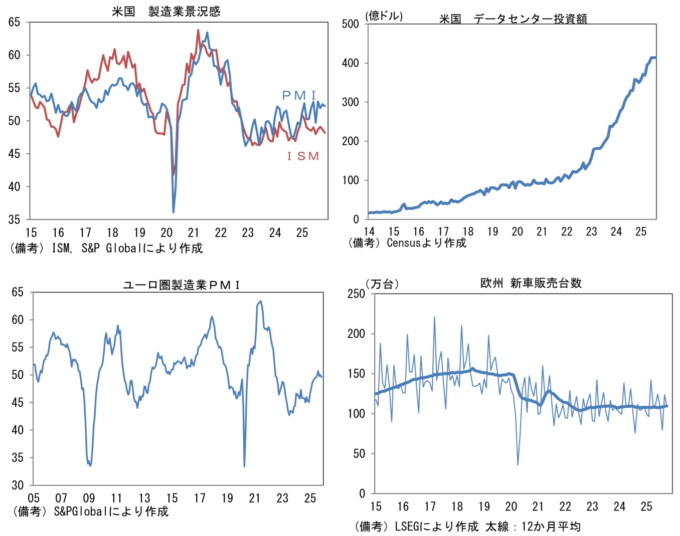 - 米国は52.2へと0.3pt上昇した。類似指標のISM製造業(48.2)との乖離が目立っているため、強さを割り引く必要はありそうだが、米国内におけるAI関連投資が隆盛を極めるなか、その恩恵が広がりを持ちつつあることを示唆している。データセンター投資は半導体に限らず、建設、発送電、冷却装置といった具合に広がりを持っている。11月は自動車販売台数も1560万台(年換算)と底堅さを維持しており、そうした下で景況感は良好に推移している。ユーロ圏は49.6へと0.4pt低下して再び50を割れた。財政拡張に舵を切ったドイツが48.2(10月49.6)と低下。2022年6月以来の50回復が遠ざかった。フランスも47.8(同48.8)へと低下。イタリア、スペインが50超で推移し域内景気を下支えしたが、全体として増勢は鈍化している。なお、欧州の新車販売台数はコロナ期に生じた断層が埋まる気配は感じられない。