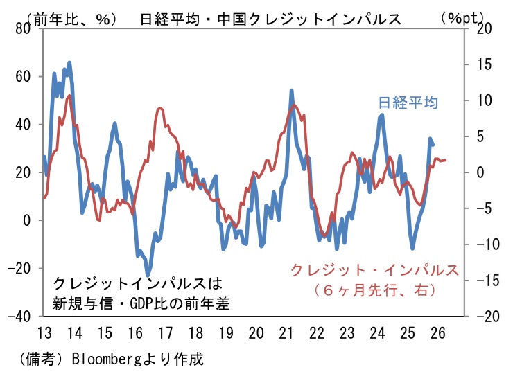 - 中国は49.9へと0.7pt低下したものの、4ヶ月ぶりに50を下回った。既往の不動産市況悪化とトランプ関税対策として、中国当局は景気対策を強化しているものの、息切れ感が窺える。中国当局の政策態度を映じるといわれるマネー関連統計に目を向けると、10月の社会融資総量(新規フローの12ヶ月平均値)は前月比▲1.6%と3ヶ月連続で減少し、残高でみても前年比+8.5%と鈍化傾向にある。新規融資のGDP比(前年差)をとった通称クレジットインパルスは+1.7ptと横這い状態となっている。この指標が日本株の先行指標として機能してきた経緯を踏まえると、現在の株高は一定の裏付けを伴っていると言えるものの、先行きは上値が重くなると予想される。