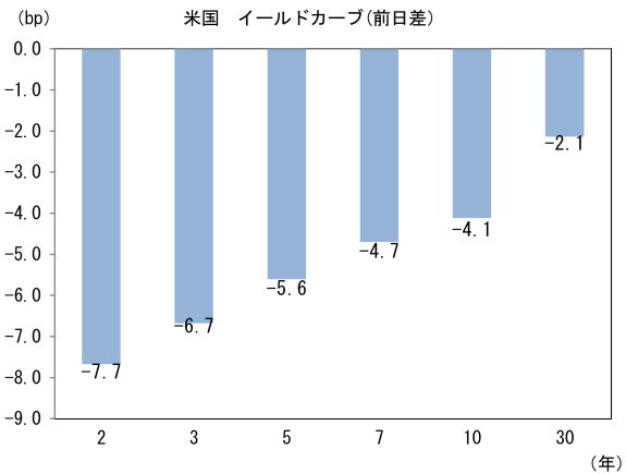 - 米金利はカーブ全般で金利低下。予想インフレ率(10年BEI)は2.270%(+0.0bp)へと上昇。実質金利は1.860%(▲4.0bp)へと低下。長短金利差(2年10年)は+60.7bpへとプラス幅拡大。