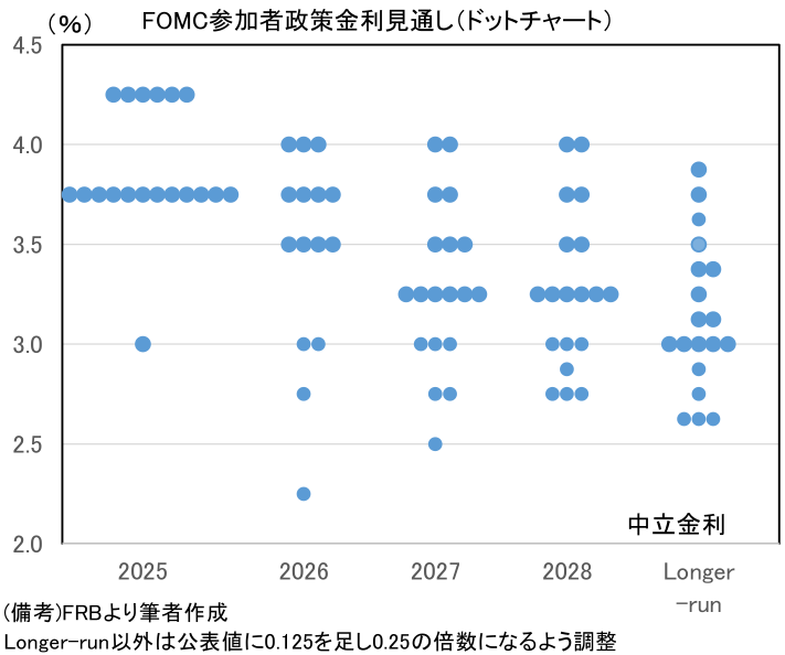 ドットチャートに目を向けると、2025年末は中央値として3.75%、2026年末は3.5%として1回の利下げ、2027年~2028年末にかけては3.5%で据え置きという数値であった。中立金利は3%で不変も平均値は3.13%へと小数点2桁ベースで僅かに上昇した。2026年以降について、グラフの形状は縦長になっており、予想に大きなばらつきがあることが窺える。また2027年と2028年の形状がほとんど同じであることは、遠い将来の予測に自信を持てない参加者が多いことを物語っているのだろう(≒よく分からないので横置きにする)。