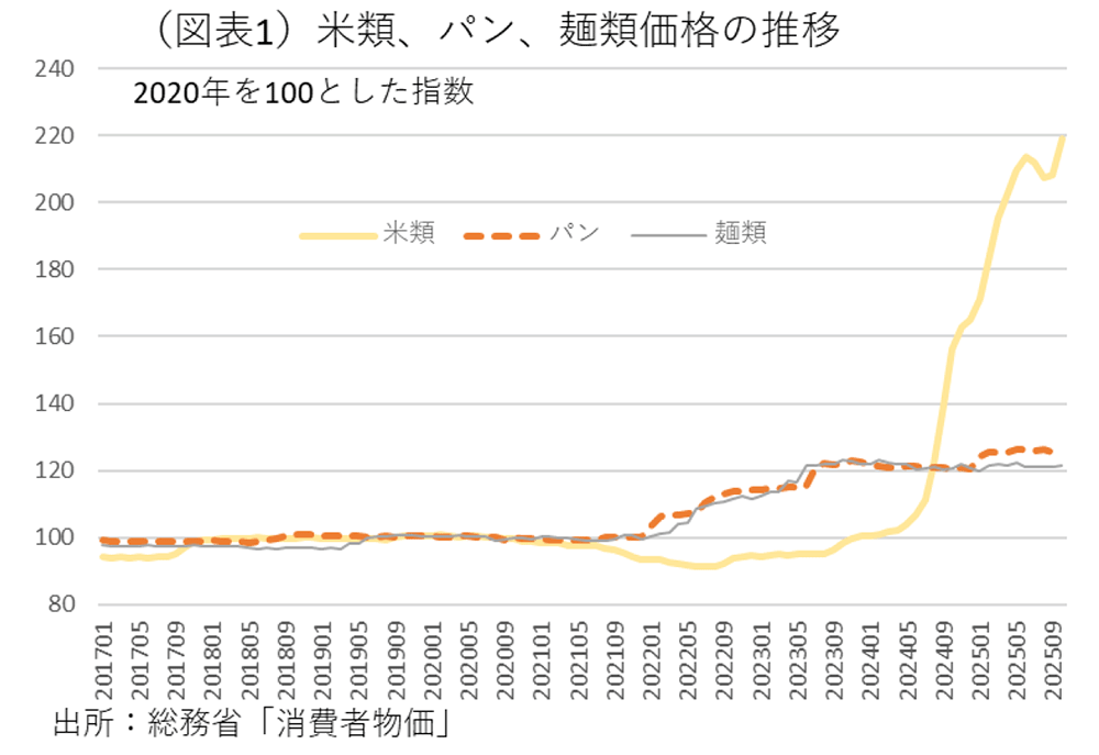 しかし、こうした趨勢的変化があっても、前述のように、ここにきて消費量がいくらか増加しているデータもあるのは驚きである。理由は、主食のコメの代替品であるパン、麺類の高騰だろう(図表1)。原材料になる小麦価格が2021~2023年にかけて高騰し、その波及効果が加工品であるパンや麺にも及んだ。これに対して、コメ価格は、少し前までは価格安定が続いてきた。家計は割安だったお米に需要をシフトさせてきたと考えられる。その流れが現在まで続いてきていると考えられる(価格に対する需要の弾力性は低く、消費量の変化には大きなタイムラグがある)。