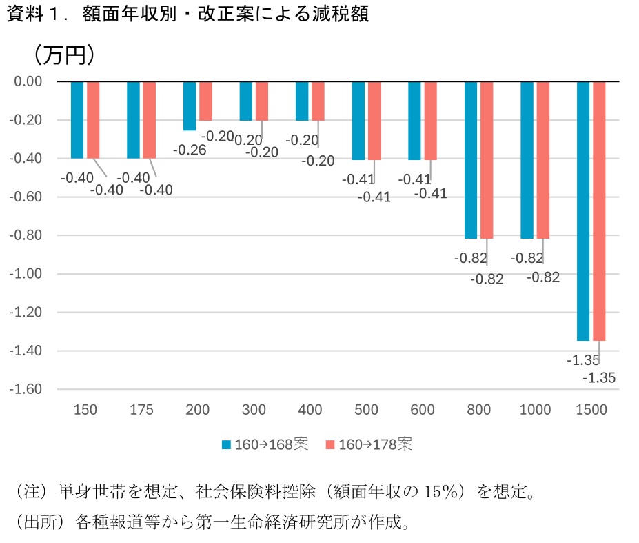 一方、試算では特例措置が適用されているはずの年収150万円、175万円の年収者でも減税額が変わっていない。これは、所得税の課税所得が現行の160万円の控除で、既にゼロになっており、所得税の支払いがないためである。試算では、一般的な労働者を仮定し社会保険料を支払っていることを想定している。例えば、例えば、額面年収の15%を社会保険料として支払っている場合、175万円×15%=約26万円が社会保険料の支払額となる。税制では社会保険料の支払額は社会保険料控除として所得控除の対象となる。このため、現行の制度における課税所得は175万円(額面年収)―160万円(基礎控除+給与所得控除)―約26万円(社会保険料控除)でマイナスで、課税所得はすでにゼロになっている。基礎控除+給与所得控除の160万円を168万円・178万円に引き上げても、所得税の課税所得はゼロのままで変わらない(年収200万円を下回る年収で減税額が生じているのは、住民税にも適用される給与所得控除最低額引き上げの影響)。年収200万円の場合にはわずかに課税所得が残っているため、約600円/年程度減税額が増えているが、168万円案と178万円案との間で減税規模の差はほとんどないと言っても良いレベルである。