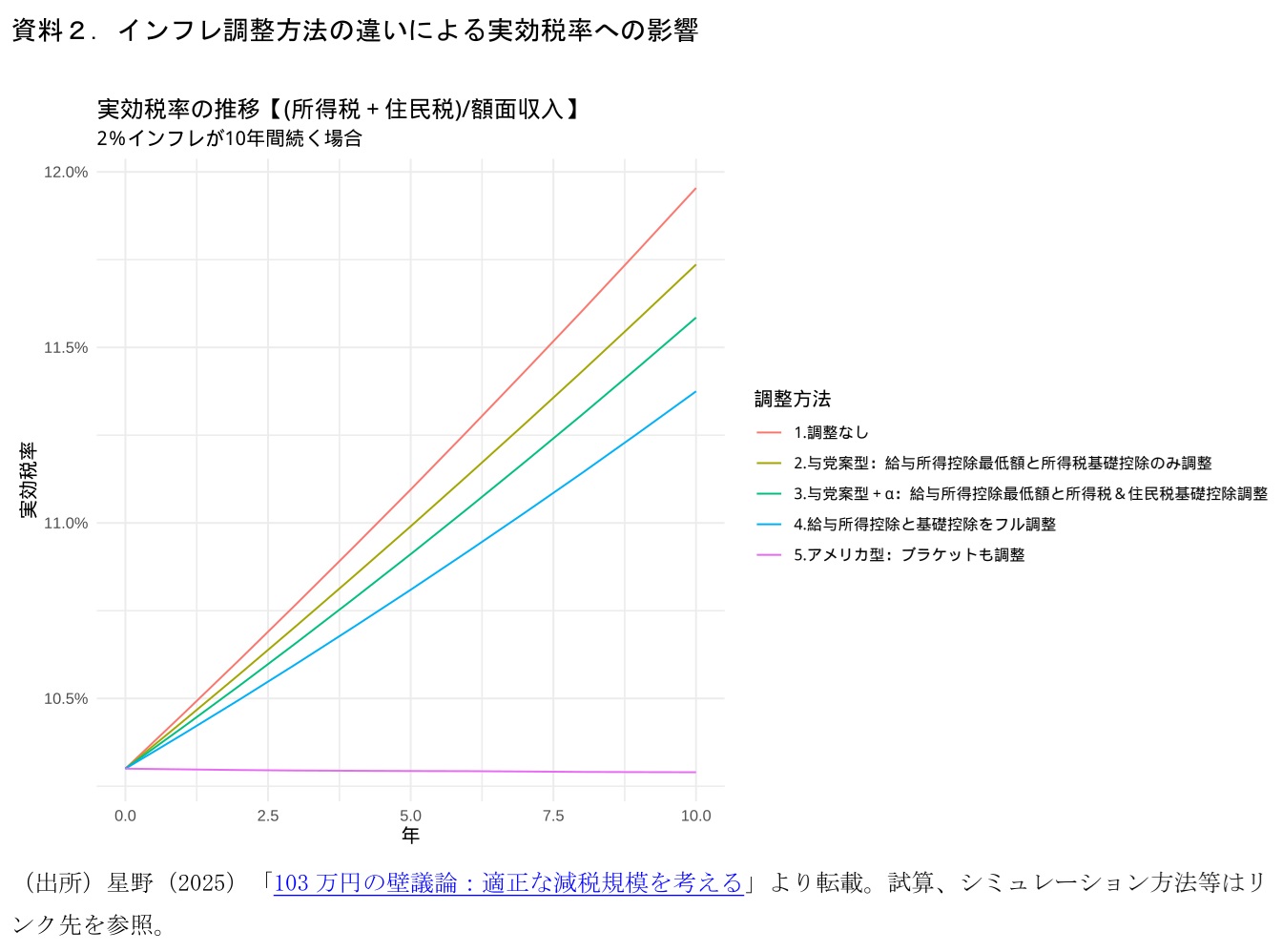 この2つを合わせて物価上昇率に合わせて調整しなければ、物価・賃金の上昇下で実効負担率(税額/額面収入)は上昇してしまう。冒頭の参考文献②ではこの点についてシミュレーションを用いて検証しており、現在の案で示されている所得税の課税最低限の引き上げと給与所得控除最低額のみを物価(賃金)上昇率に合わせて引き上げる場合、インフレによる実効税率を抑えるのに必要な減税額の7分の1から8分の1程度にしかならないとの結果を得ている(資料2)。