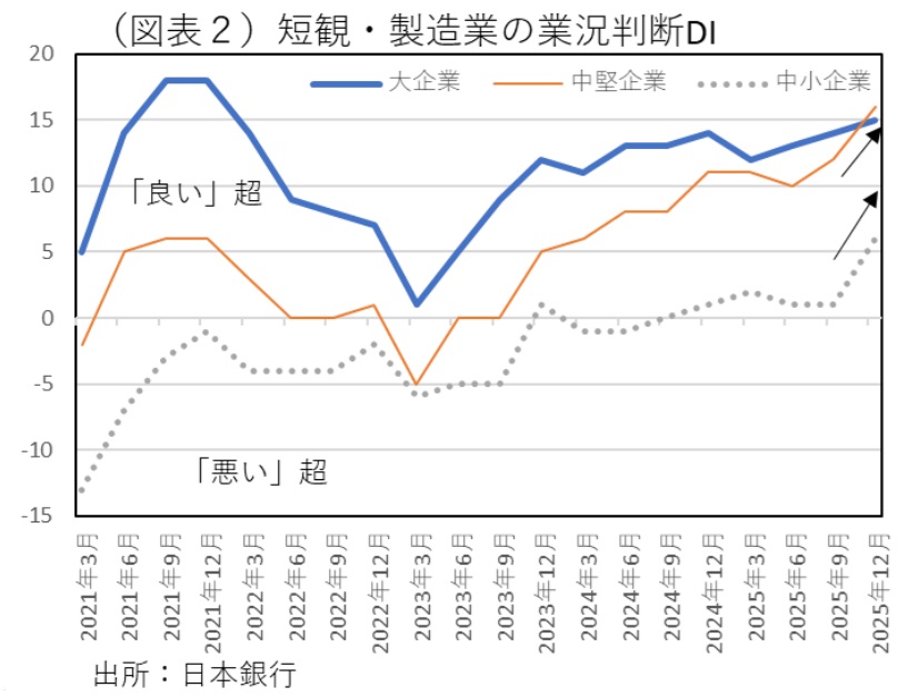 筆者は、ヒアリング以外にも12月15日発表の日銀短観結果が鍵になっているとみている。12月短観は、とかく大企業・製造業の業況判断DIに注目が集まるが、焦点は中堅・中小企業の変化だった。大企業・製造業のDIが前回比+1ポイントの上昇に対して、中堅企業・製造業は同+4ポイント、中小企業・製造業は同+5ポイントと大幅に上昇している(図表2)。これは、トランプ関税への懸念から自動車産業などが強い警戒感を抱いていたのが、ここにきて和らいだからだ。大手自動車メーカーの半期決算では、まだ関税負担の重さだけが際立っていた。それが短観では、以前よりもトランプ関税の脅威が小さくなっている姿が明らかになった。ならば、来春闘における賃上げの重石も少しは軽くなったとみることができる。FRBの利下げで、自動車メーカーなど輸出企業が米国で値上げしやすい環境になってきたことも追い風と言える。これが、来春闘に向けた明るい動きだと評価できる。植田総裁にとって、12月短観はやはり利上げに向けて決め手になる経済指標だったと思える。