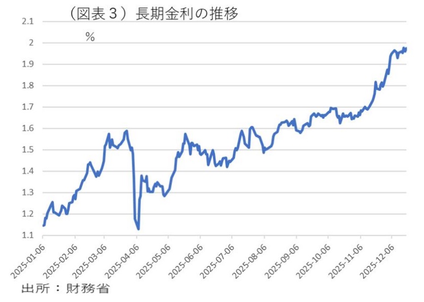 長期金利はいよいよ2%の大台に乗ろうとしている(図表3)。約1年前の2024年末は1.11%だったので、そこから+1.0%近い上昇である。このピッチは早すぎる。その主因は、財政不安と物価上昇リスクによるものだが、日銀の追加利上げもそこにいくらか加わっている。