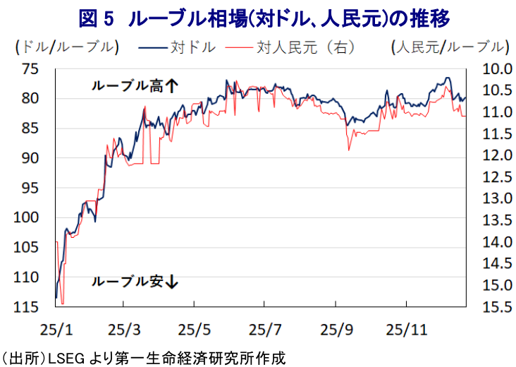 - 金融市場では、ウクライナ戦争の早期終結期待を背景にルーブル相場は底堅いものの不透明感も残る。中銀は為替や原油価格を含む多様な要因を見極めつつ、難しい政策判断を迫られる状況が続くであろう。