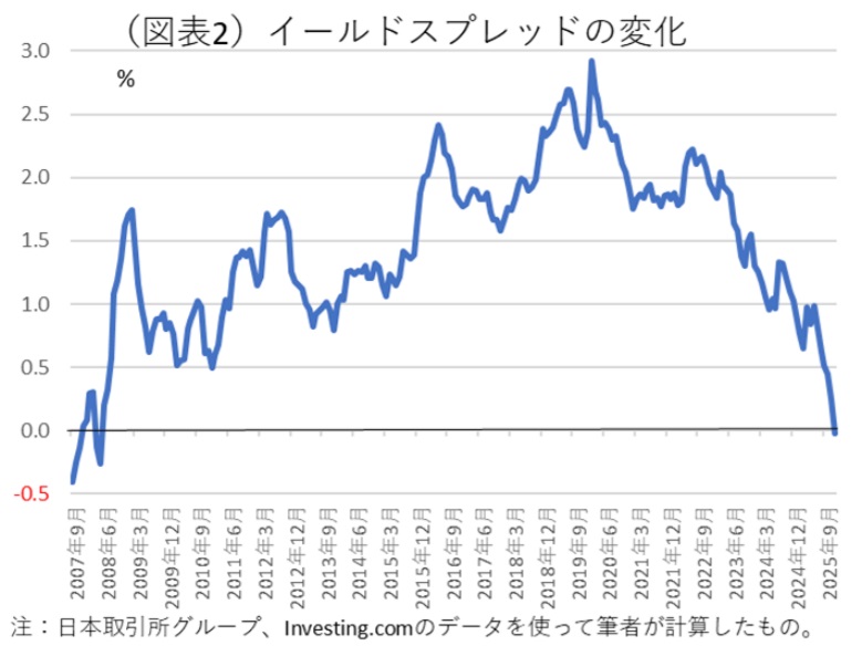 長期金利が27年ぶりの水準になって、もう1つの歴史的な変化も起ころうとしている。それは、株式配当利回りと長期金利のギャップがマイナスに転じる変化である(2025年12月はまだ終わっていないがその可能性は高い)。日本取引所グループの統計で株式の配当利回り(プライム市場の加重平均利回り)は2025年11月で2.05%である。この数字が12月も同じ水準になり、長期金利が2.10%以上になれば、イールドスプレッドはマイナスに転じる(図表2)。長期金利>株式配当利回り(2022年末以前は1部市場の加重平均利回り)になるのは、2008年4月以来のことである。2025年12月にイールドスプレッドがマイナスに転じれば、これは2008年4月から数えて17年半ぶりという変化になる。繰り返しになるが、主因は日本の長期金利が急上昇していることにある。