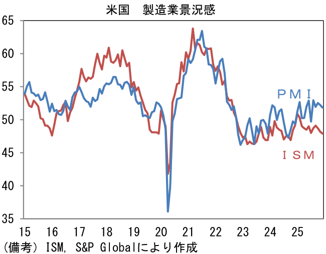 米国株の企業収益を推し量る上で筆者が重視しているISM製造業景況指数は2025年12月に47.9と低調な値。小幅な改善を見込んでいた市場予想(48.4)に反して前月から0.3pt低下した。ヘッドラインを構成する5つの項目は生産(51.4→51.0)が小幅に低下、反対に新規受注(47.4→47.7)と雇用(44.0→44.9)は50以下の領域ながら改善。その他ではサプライヤー納期(49.3→50.8)が長期化しヘッドライン押し上げに寄与、在庫(48.9→45.2)は減少しヘッドライン下押しに寄与。1~3ヶ月先の生産活動を読む上で有用な新規受注・在庫バランスは僅かに上向いたものの、製造業の景況感がなお冴えないことを浮き彫りにした。