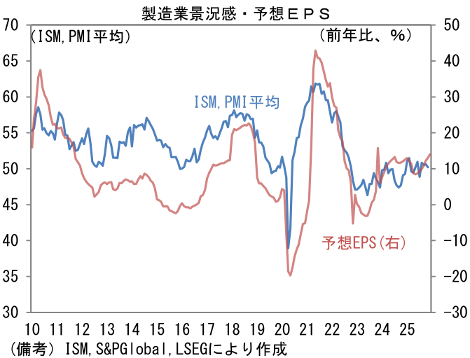 - ISM製造業と製造業PMIの平均値は49.9と昨年来のレンジ内で推移。企業収益(予想EPS)の増勢が加速も鈍化もしない領域にある。筆者が期待するメガテック企業のAI関連投資が製造業に波及することで企業収益の拡大が幅を持つ構図は未だ実現していない。