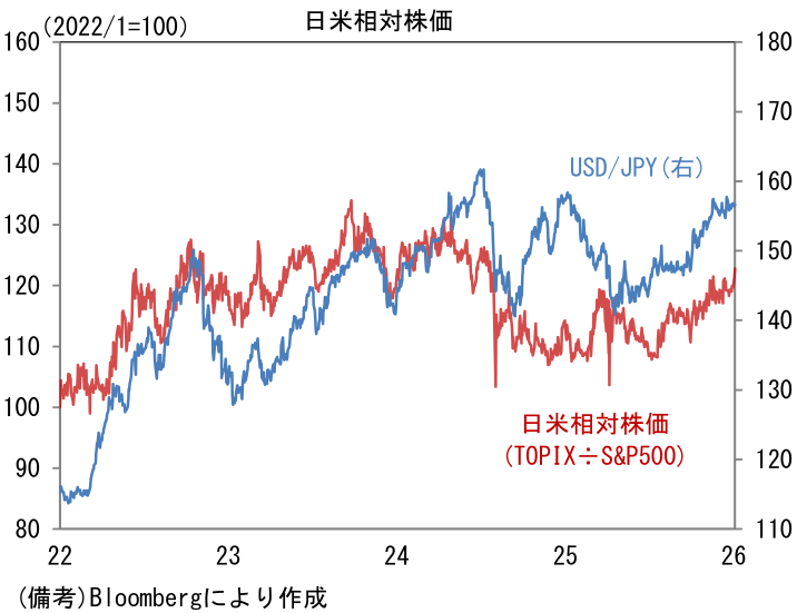 こうした状況は、日本株の相対優位に繋がり易いだろう。Fedの利下げ観測後退がドル高圧力に変換され円安が持続すれば、日本企業の収益がかさ上げされ、日本株の見映えが良化する。事実、円安局面で日米相対株価(TOPIX÷S&P500)は上昇する傾向にある。過去数年、日本企業は円安の追い風を除いてみても収益が高まっていることは事実であるが、依然として円安は日本株の押し上げ要因として重要な要素であることを物語っている。