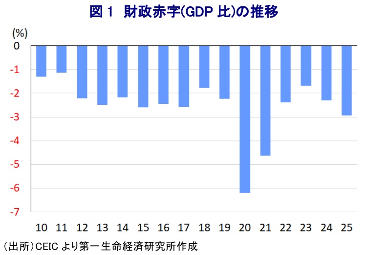 なお、25年7-9月の実質GDP成長率は前年同期比+5.04%と前期(同+5.12%)から鈍化するも一見堅調に推移している。しかし、当研究所が試算した季節調整値に基づく前期比年率ベースの成長率は約3年ぶりの低い伸びに留まり、足元の景気は頭打ちの様相を強めている(注1)。プラボウォ政権は景気下支えに向けて、25年9月に食糧支援や緊急雇用措置として、コメの配布や観光業従事者に対する所得税免税、インフラ整備、新卒者に対する有給のインターンシップ、運送業従事者に対する公的傷害保険の保険料減免、零細企業に対する売上税の据え置きなど総額16.23兆ルピア(GDP比0.07%)規模の総合経済対策を公表した。さらに、翌10月にも追加的な経済対策として総額30兆ルピア(GDP比0.13%)規模の現金給付のほか、有給インターンシップの拡充、年末年始の航空運賃に対するVAT(付加価値税)の減免などを実施する方針を示した。このように小出しの対応が続く背景には、前述のように金融市場において財政運営に対する警戒感が根強いことが影響している。こうしたなか、2025年度の財政赤字が695.1兆ルピア(GDP比2.92%)となり、政府想定(同2.78%)を上回り法定上限(3%)に近い赤字となったことを明らかにした。プルバヤ財務相は、25年度の財政赤字が拡大した理由について、経済の拡大を維持することを目的としたものとしたうえで、今年度は経済見通しが良くなれば赤字は縮小する可能性があるとの考えを示した。ただし、25年の赤字幅はコロナ禍対応に追われた2020年度と翌21年度を除けば約20年ぶりの水準となり、足元の財政状況は悪化の度合いを増している。財政赤字が拡大した一因には、景気減速に伴う税収減が想定以上に進んでいることも影響している。