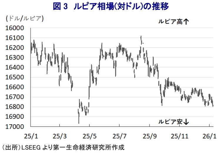 過去数年は生活必需品を中心とする物価上昇に加え、コロナ禍からの景気回復の動きも重なりインフレが上振れしたものの、2022年末を境にインフレは鈍化に転じるとともに、23年半ば以降は中銀目標の域内で推移するなど落ち着いた動きをみせている。したがって、中銀は24年9月にコロナ禍一巡後初の利下げに動くとともに、漸進的に計6回、累計150bpの利下げを実施するなど、金融緩和に動いてきた。なお、25年以降のインフレは前年に鈍化の動きを強めた反動で加速に転じているものの、25年12月時点においても前年同月比+2.92%と中銀目標(2.5±1%)の範囲内に収まっている。こうした状況にもかかわらず、中銀は先月の定例会合で3会合連続の金利据え置きを決定し、さらなる金融緩和に二の足を踏む動きをみせている。背景には、前述のように財政悪化が懸念されるなか、金融市場において通貨ルピア安圧力が根強く残ることが影響している。中銀はルピア相場の安定を目的に、スポット市場、ノンデリバラブル・フォワード市場、債券市場の3市場において為替介入を実施していることを明らかにしている。にもかかわらず、足元のルピアの対ドル相場は1年前よりも安い水準で推移するなど調整圧力に晒されている。さらに、足元ではルピア安の進行に伴う輸入物価の押し上げがインフレ圧力を高める動きも確認されている。政府は景気拡大の実現に向けて、中銀に『暗黙の圧力』を掛ける形で追加利下げを後押しする動きをみせているものの、追加利下げのハードルが極めて高い状況にある。