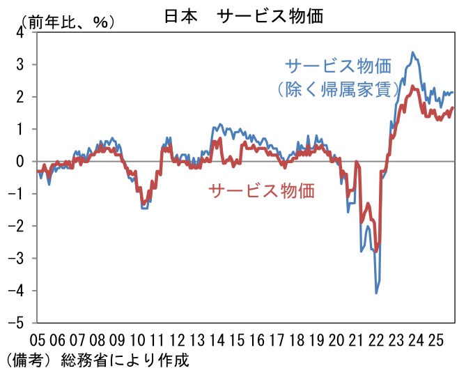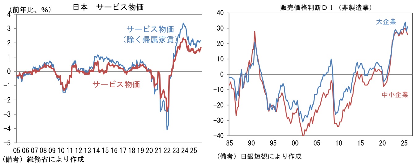 - 筆者は日銀の次回利上げを2026年7月と予想する。物価上昇率はガソリン、電力・ガスの引き下げなど政策要因と米価の「前年の裏要因(ベースエフェクト)」を含む食料品価格の伸び率鈍化などから、2026年度は2%を割り込んでの推移が予想されるものの、それらを除いた根底にあるインフレ圧力は残存することから、日銀は緩和度合いの縮小を続けるだろう。たとえば、サービス価格は家賃を除いたベースでは2%程度にあり、賃金と物価の相互刺激が見て取れる。日銀短観の販売価格判断DI(非製造業)は、歴史的高水準にあり内生的なインフレ圧力の強さが窺える。