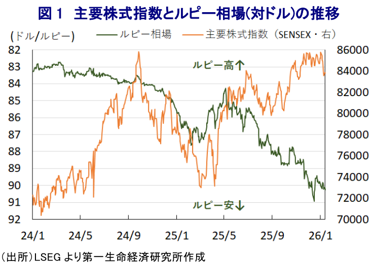 こうした状況にもかかわらず、足元の主要株式指数(ムンバイSENSEX)は上値の重い展開が続いている。さらに、通貨ルピーの対ドル相場は先月に最安値を更新、その後は一時的に底入れするも、足元では再び軟調な動きをみせている。この背景には、米国が昨年8月、ウクライナ戦争以降にインドがロシア産原油の輸入を拡大させていることに対するペナルティーとして、同国に対する関税を50%(相互関税(25%)+2次関税(25%))に引き上げたことを機に、米国との関係を巡る不透明感が根強いことが影響しているとみられる。なお、両国は通商協議を継続しているほか、インド政府高官はたびたび両国の合意が近付いているとの見方を示してきたものの、足元においても合意に向けた道筋が描けない状況が続いている。