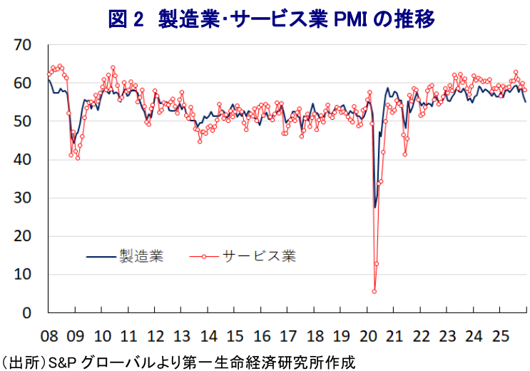 こうしたなか、モディ政権はトランプ関税による景気への悪影響を軽減すべく、昨年9月末からGST(財・サービス税)の実質引き下げに動いている。さらに、GST実質引き下げによりインフレが大きく鈍化したことを受けて、RBI(インド準備銀行)は昨年12月の定例会合で利下げに加え、金融市場の流動性拡大を目的に大規模な公開市場操作と為替スワップを実施する方針を決定しており(注1)。財政、金融政策の両面で景気下支えを図る姿勢を鮮明にしている。GSTの実質引き下げによるインフレ鈍化も追い風に、その後の自動車や二輪車の販売台数は大幅に押し上げられており、インド経済は個人消費など内需が成長のけん引役となってきた。RBIによる利下げ実施の直後には主要株式指数は上昇して2024年9月に付けた最高値を一時更新する動きをみせたものの、その後は上値の重い展開が続いている。財政、金融政策の総動員による景気下支えにもかかわらず、足元の企業マインドは製造業、サービス業ともに頭打ちの動きを強めており、受注動向が悪化するとともに、雇用拡大の動きも一服している。このように早くも政策効果の息切れが意識される兆しがみられることも、市場マインドの足かせとなっていると考えられる。