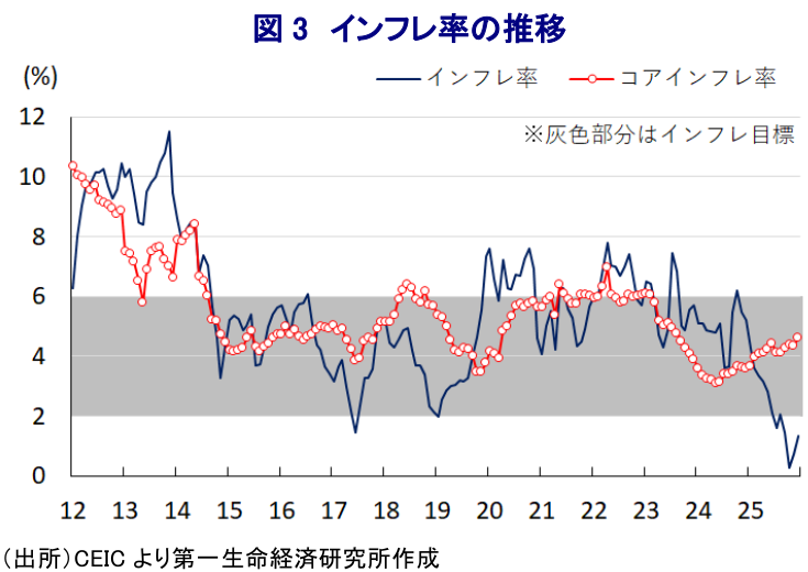 - 市場ではさらなる利下げへの期待があるが、物価動向は複雑である。インフレ率は低水準で推移するが、コアインフレ率は加速しており、通貨ルピーも防衛ラインを割り込む安値圏にある。一段の緩和はさらなる通貨安と物価上昇を招く恐れがあるため、当面は市場の思惑が交錯する不安定な状況が続くであろう。