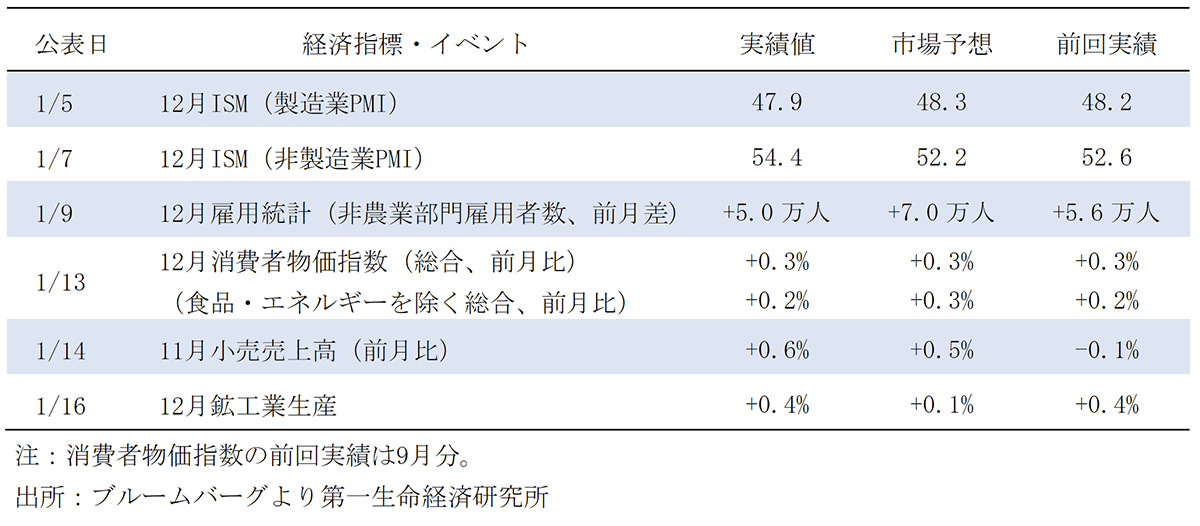 他方、12月ISM非製造業PMIは54.4(52.6)と3か月連続で上昇した。足下のサービス業活動は好不況の節目となる50を上回るなど、底堅く推移している。内訳をみると、事業活動が56.0(54.5)、雇用が52.0(48.9)、新規受注が57.9(52.9)と幅広い項目で上昇した。企業コメントでは「休暇シーズンによりビジネス活動が活発化している(輸送・倉庫)」や「総じてビジネスは堅調(金融・保険)」といった前向きなコメントが見られる一方、「バリューブランド(低価格帯)は引き続き高い需要を維持しているものの、プレミアムブランド(高価格帯)は市場シェアの維持に苦戦している(農林水産業)」など消費の二極化を指摘する声がある(詳細は「トランプ関税で米製造業の縮小が継続(12月ISM製造業)」及び「米国 懸念をよそに非製造業の拡大ペース加速(12月ISM)」)。
