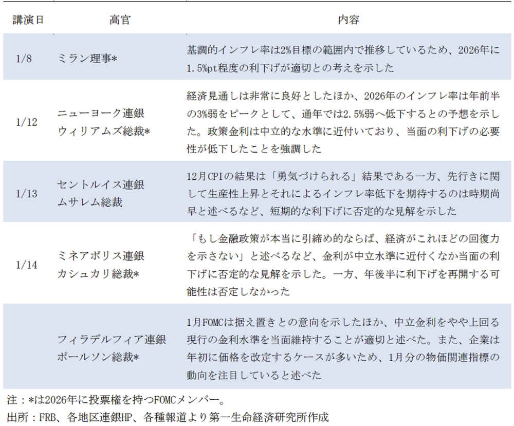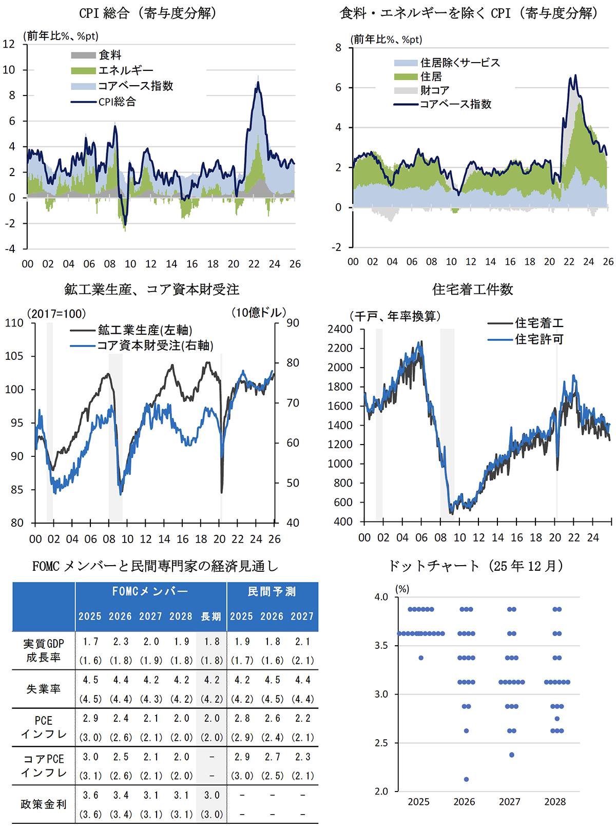 12月CPIでは関税によるインフレへの影響が依然緩やかに留まった。2026年の金融政策は5月以降に就任する新議長の政策スタンスとその指導力に大きく依存する。一方、トランプ政権によるパウエル議長の刑事捜査を背景に新議長の指名が円滑に進まない懸念が浮上している。