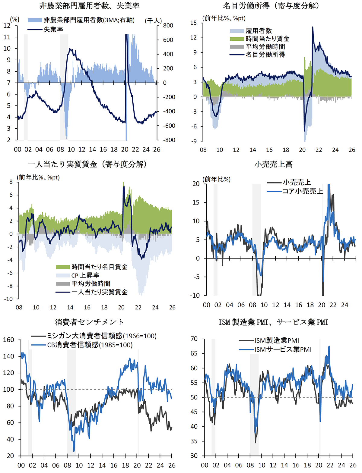 12月雇用統計における非農業部門雇用者数は前月差+5.0万人(11月:+5.6万人)と2か月連続で増加した。3か月移動平均では-2.2万人(-0.3万人)と、10月における政府職員の大量離職(1月に実施した早期退職プログラムの影響)を背景に3か月連続で減少したものの、こうした影響が剥落する1月分ではプラスに転じる可能性が高い。12月の雇用者数を業種別にみると、医療・社会福祉は前月差+3.85万人(+5.81万人)と人手不足を背景に46か月連続で増加し全体を押し上げた。また、娯楽・宿泊業も+4.7万人(-0.3万人)と休暇シーズンのレジャー需要などを背景に前月水準を上回った。一方、小売業は-2.5万人(-1.69万人)、専門・企業サービスは-0.9万人(+1.3万人)、製造業は-0.8万人(-0.2万人)とそれぞれ減少するなど、景気に敏感な産業の雇用は停滞が持続している。他方、政府部門は+1.3万人(+0.6万人)と2か月連続で増加したものの、連邦政府職員に限ると2025年通年では-14.9万人の減少となるなど、トランプ政権による政府職員削減の影響がみられる。