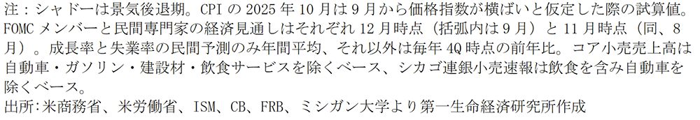 先行きのCPIを巡っては、サービス価格は労働需給緩和による賃金上昇率の安定や家賃の鈍化を背景に減速が続く可能性が高い。一方、財価格は追加関税による輸入物価上昇の影響が時間をかけて波及するとみられ、特にCPI上のウェイトが大きい新車やアパレルへの価格転嫁動向が注目される(詳細は「米国 安定も政府機関閉鎖お承認による歪みが残存(12月CPI)」)
