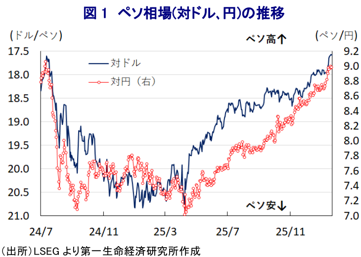 このところの金融市場においては、メキシコの通貨ペソの対ドル相場が上昇の動きを強めており、1年5ヶ月ぶりの高水準となっている。こうした動きも要因として、ペソは日本円に対しても上昇基調を強めている。背景には、メキシコ中銀が先月開催した定例会合で12会合連続の利下げを決定する一方、先行きの政策運営に関する表現振りを変更してガイダンスを修正するなど、利下げ局面の終了を示唆したことがある(注1)。さらに、今月初めに公表された議事要旨においても、政策委員が2026年の利下げ実施に対して慎重姿勢を示したことが明らかにされた。その理由として、通商を巡る不確実性に加え、メキシコ政府が今月から中国を念頭に、同国と貿易協定を締結していない国からの輸入品に最大50%の追加関税を課す措置を発動させること、ソーダやタバコ、ビデオゲームなど特定品目を対象とする新たな特別税を課していることを挙げている。政策委員の概ねは追加関税や新税導入による物価への影響は一時的なものに留まるとみているものの、仮に影響が長期化する場合には警戒すべきと主張しており、当面は物価動向を注視する必要性が高まっている。