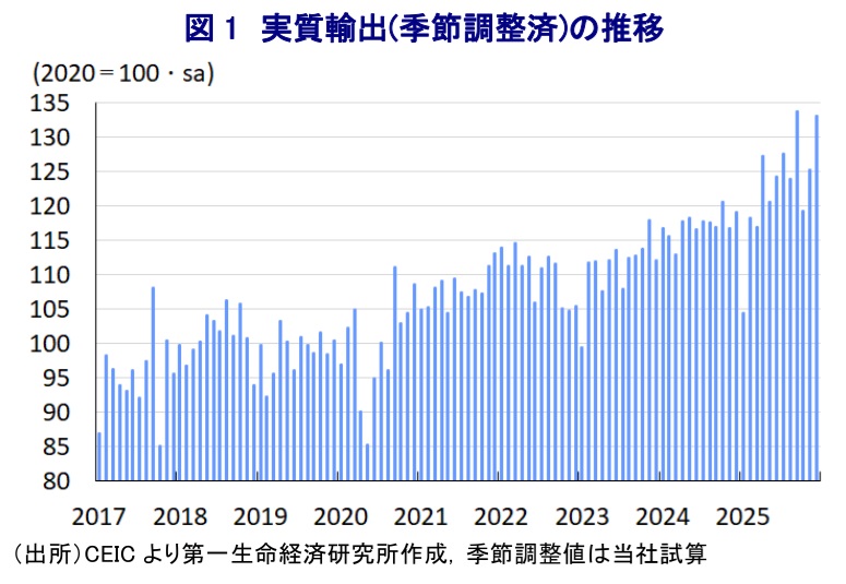 2025年の韓国経済を巡っては、前年末に尹錫悦(ユン・ソンニョル)前大統領が非常戒厳を発令し、直後に弾劾訴追を受けることが決定するなど、政治的混乱のなかで幕開けを迎えた。その後、尹氏に対する弾劾が成立するとともに、大統領選を経て李在明(イ・ジェミョン)氏が当選して3年ぶりの革新政権が発足した。その結果、大統領と議会とのねじれ状態は解消するなど、政治的には安定が図られている。一方、経済面ではトランプ米政権による関税政策に翻弄された。韓国経済にとって、対米輸出は総輸出の2割、名目GDP比で7%に及ぶなど関税政策の影響は無視できない状況にある。こうしたなか、米国は当初、韓国に対する相互関税を25%にすると通告したが、両国による協議を経て15%に引き下げることで合意した。2025年10月末のトランプ氏の韓国訪問に際して、両国は関税や安全保障問題で合意した。しかし、詳細を巡る両国の認識に隔たりが顕在化するなど、詰めの協議が難航した模様である。最終的に、米国は2025年12月初めに合意を履行するとともに、11月に遡求適用する方針を明らかにするなど、トランプ関税に伴う直接的な影響は軽減されている。さらに、世界的にはトランプ関税の本格発動を前に対米輸出に『駆け込み』の動きが出て貿易が活発化する動きがみられるなか、韓国においても2025年末にかけて輸出が拡大する動きが確認されるなど、外需による景気下支えが示唆されている。
