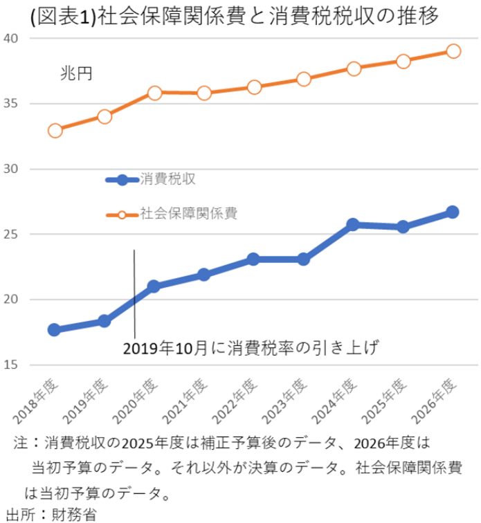 確かに、一般会計の社会保障関係費の推移(当初予算)は、それほど大きく伸びていない(図表1)。2021年度以降、平均1.4%で伸びている。これは消費税の高い伸び率(同期間4.2%)に比べると小幅である。それでも、社会保障関係費(2026年度39.1兆円)に比べて、消費税収(同26.7兆円)は、財源のすべてを賄えている訳ではない。消費税減税は、もともと開いていた穴を再び広げるような対応を採ることになりそうだ。