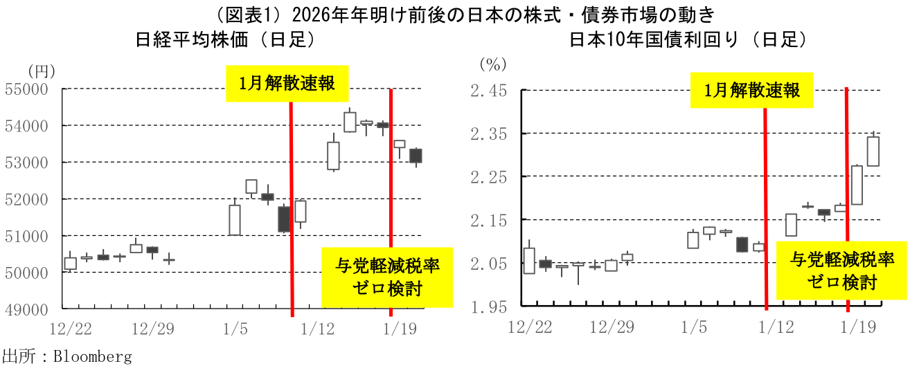 年明け後、それまで早期の解散総選挙に慎重とみられていた高市首相が、一転して通常国会開始早々の解散総選挙に踏み切るとの見方が台頭したことで、1月13日以降のマーケットは大きく動いた(図表1)。