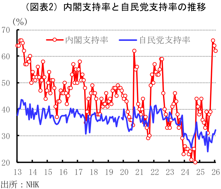 第一に、高市内閣の支持率は高い水準を維持しているものの、自民党の支持率は低迷しているため、高市人気が自民党への票に繋がるかどうかはわからない(図表2)。