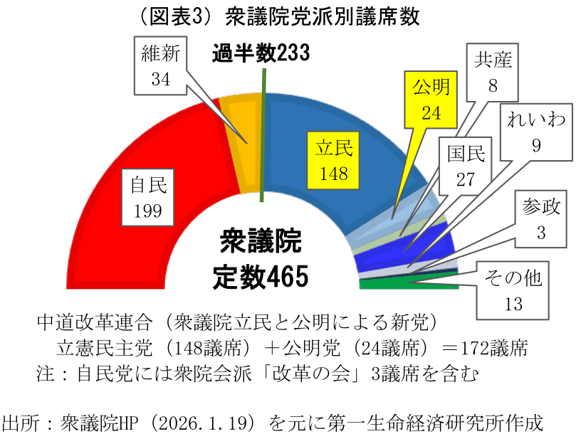 解散時の衆議院の党派別議席数は、与党が自民の199議席と維新の34議席を合わせて233議席となり、全465議席の過半数ちょうどである。つまり、1議席でも減らせば、維新との連立成立前の“少数与党”に逆戻りすることになる(図表3)。