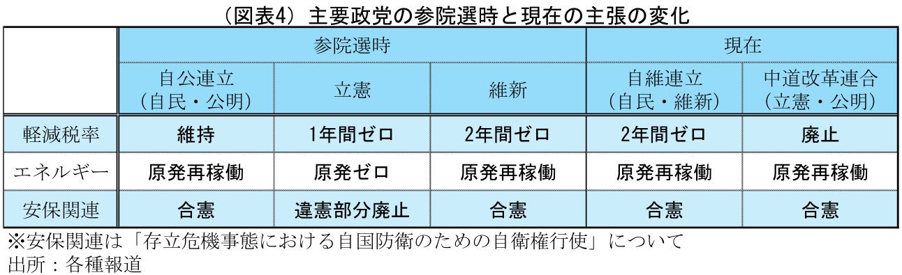 第三に、与党と中道改革連合が主張する政策の違いが少なくなっているため、無党派層の投票先が読みにくくなっている(図表4)。経済政策においては、どの政党も物価高対策を重要視しているが、これについて自民党が食料品にかかる軽減税率(8%)を2年間ゼロとする案を打ち出した。昨年の参院選時には、自民・公明の与党は軽減税率の引き下げには否定的だった一方、立民は1年間限定でゼロへの引き下げ、維新は2年間ゼロといったように、主要野党は消費税率の時限的な引き下げや廃止などの案を打ち出していた。今回、自民党が飲食料品にかかる軽減税率の時限的な対象外を打ち出したことで、与野党間の物価高対策の差は相当程度埋まったことになる(中道改革連合は軽減税率廃止を打ち出して差別化を図った)。一方、立民は公明党と中道改革連合を組むにあたり、原発政策や安保関連で公明党の主張に合わせたことで、当該分野での自民党との明確な違いは分かりづらくなっている。