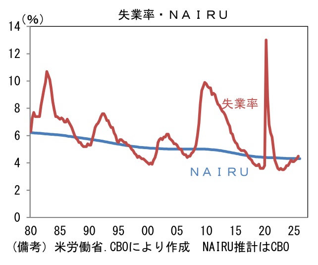 声明文では景気の総括判断が上方修正され、前回までの「緩やかなペース」から「堅調なペースの拡大」と強気な表現に書き換えられた。労働市場の判断も上方修正された。前回までは「雇用に対する下振れリスクがここ数カ月間で高まったと判断する」と警戒感を強調する内容であったが、今回は「雇用の伸びは低水準のまま」との認識は維持しつつ、「失業率には安定の兆しが見られる」とされた。12月の失業率は4.4%と、直近最低値である3.5%(2023年4月)から1%pt近く高まっているとはいえ、CBOが推計するNAIRU(インフレを加速させない失業率水準)の4.3%に近い水準で推移している。