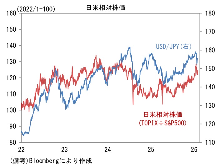 事実、円安局面で日本株は米国株をアウトパフォームする傾向が見て取れる。2025年央以降の日本株高は、トランプ関税の「軟化」に加え、円安の追い風があったとみられる。株価指数に占める製造業の割合は日経平均株価(銘柄数)が約6割、TOPIX(時価総額対比)も同程度であり、株価指数全体として、円安が業績上振れに繋がりやすいという特性があろう。このように相対株価でみると、為替と日本株には一定の関係が認められる。