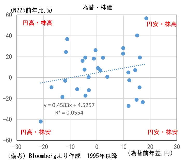 もっとも、それ以外の年は円高・株高となることも多く、2017年(株価+19%、円高4円)や2020年(株価+16%、円高5円)がそれに該当する。円高が企業収益を圧迫方向に作用した半面、世界景気の拡大や、金融緩和に伴うリスク性資産への資金流入が株価を押し上げたと考えられる。1995年以降の為替と株価について、相関係数の二乗である決定係数は0.055と無相関を意味する値となっている。