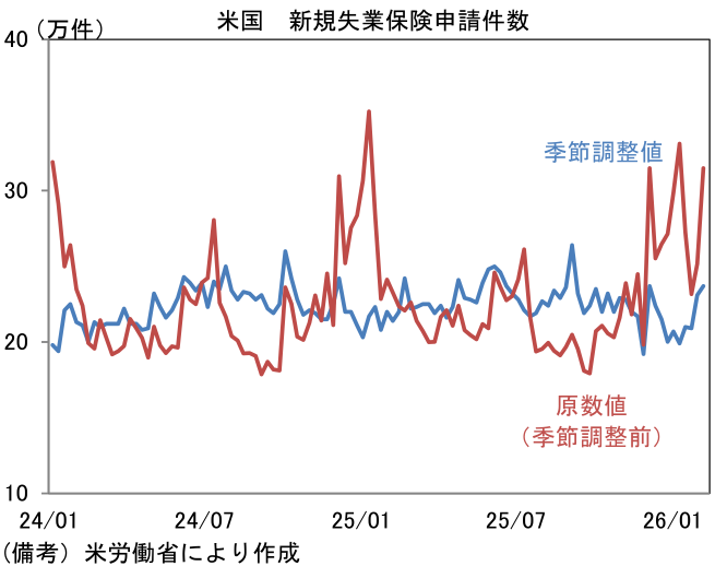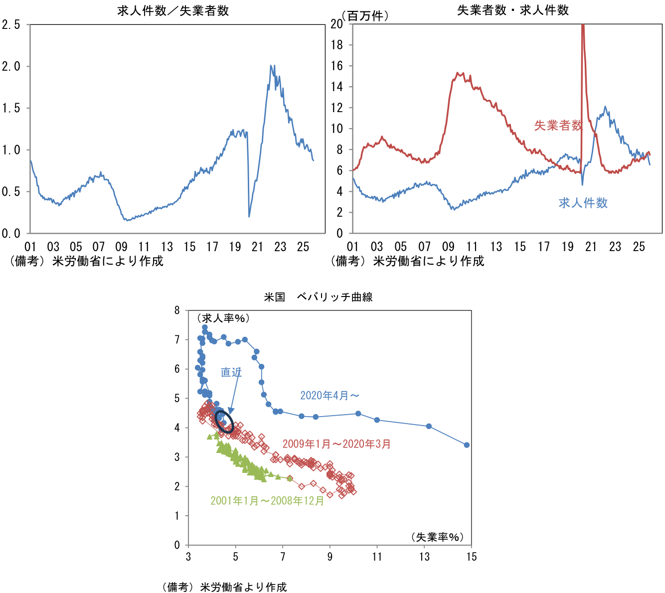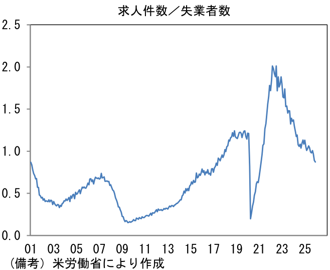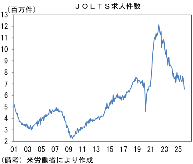 2025年12月米JOLTS求人統計は労働市場の軟化が一段と進行していることを示す結果であった。Fedが利下げに消極的な見方を維持するなか、雇用情勢の悪化は素直にBad Newsとなり、金融市場は株安、金利低下と典型的なリスクオフの反応であった。FF金利先物から逆算した3月FOMCの利下げ確率は26%(4日時点11%)、4月FOMCまでの累積では50%(同27%)、6月FOMCでは114%(同73%)までそれぞれ高まった。
