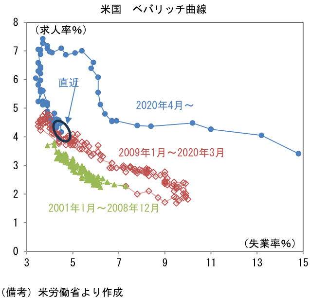 - Fedが労働需給の引き締まり度合いを計測するために重視している、失業者一人あたりの求人件数は0.87となり、直近3ヶ月で0.14%ptもの低下を記録した。失業者数と求人件数の逆転現象は必ずしも失業率上昇に直結するわけではないが、求人率と失業率の関係を示したベバリッチ曲線は右下(求人率低下・失業率上昇)に歩み出したようにみえる。2000年以降の失業率上昇局面と同じ軌道を描くなら、今後は失業率の上昇速度が加速してしまう。