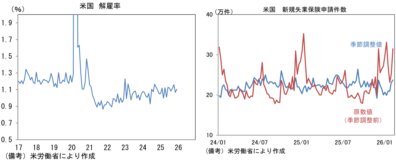- もっとも、今次局面においては解雇率が低位で安定している。10月は1.10%と前月比で不変、求人件数が減少しているにもかかわらず、ほとんど上昇の気配がみられない。昨日発表された新規失業保険申請件数は23.7万件へと増加したものの、大きくみれば横ばい圏内にあり、「出口」が広がっている様子はない。2020年から2023年頃にかけて、米企業はコロナ期に削減した労働力の回復に苦慮した。その苦い経験から既存労働者の解雇には慎重であり、新規採用の増減によって労働力の調整を行っているとみられる。一部の職種でAIによる代替が発生している可能性が指摘されているものの、全体としては「No Hire No Fire」とも言うべき状態にある。この構図が崩れない限り、失業率が急上昇する事態は回避されるのではないか。