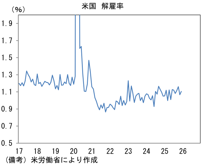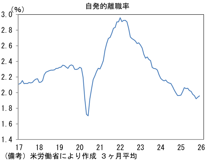 - この間、平均時給の先行指標として有用な自発的離職率は2.01%と前月比横ばいであった。もっとも、3ヶ月平均値では底打ちしている。自発的離職率の上昇は、待遇改善を求めて転職活動に励む労働者数の増加を意味していることから、賃金上昇圧力と読み替えることができる。この程度の賃金インフレ圧力(増大)は、Fedの金融政策に大きな影響を与えるものではなく、むしろ労働市場の底堅さを意識させることを通じて、金融市場の安定化に資すると筆者は判断している。